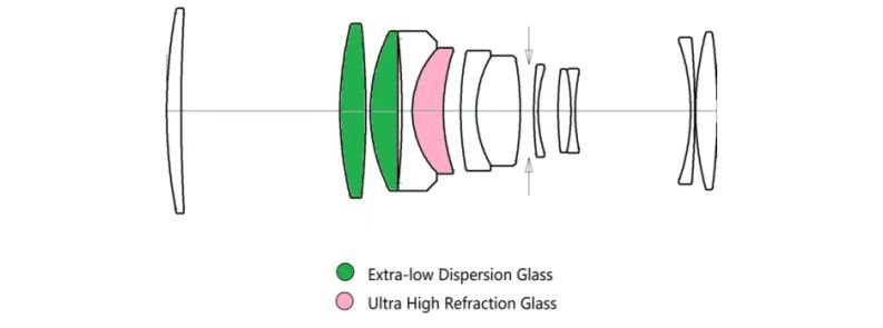 - schema ottico da 9 elementi in 12 gruppi con design apocromatico (APO) per ridurre al minimo le aberrazioni cromatiche;